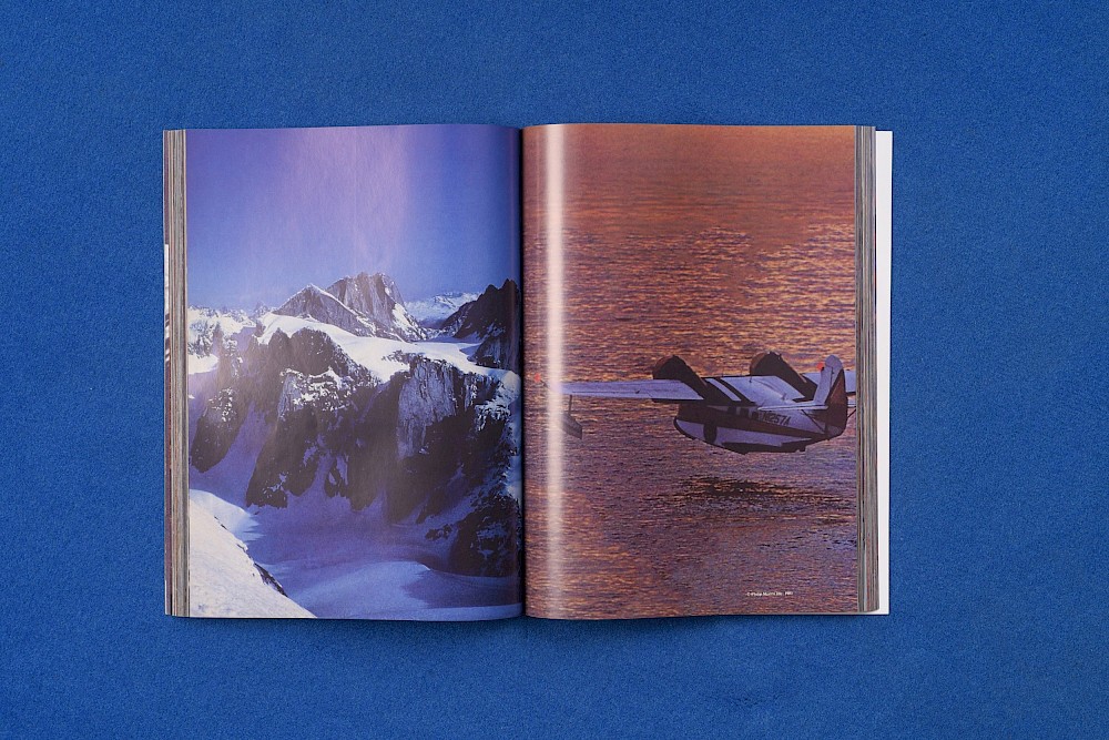 Sur la page-de-gauche, un intérieur de voiture, sièges blancs en cuir et tableau de bord noir&brillant, avec en fond le paysage de ce qui semble être un grand Nord qu’accompagnent glaciers et pins. Intérieur/extérieur : les vitres de l’automobile paraissent absentes, et les plans semblent se confondre. Le volant de la voiture – grand et rond et finement dessiné, que la portière ouverte nous invite à estimer – semble appeler l’observateur : challenge et frein à main. Enfin, c’est ce que semble penser l’homme sur la page-de-droite, cigarette tout juste allumée aux lèvres, le regard jugeant et concentré.