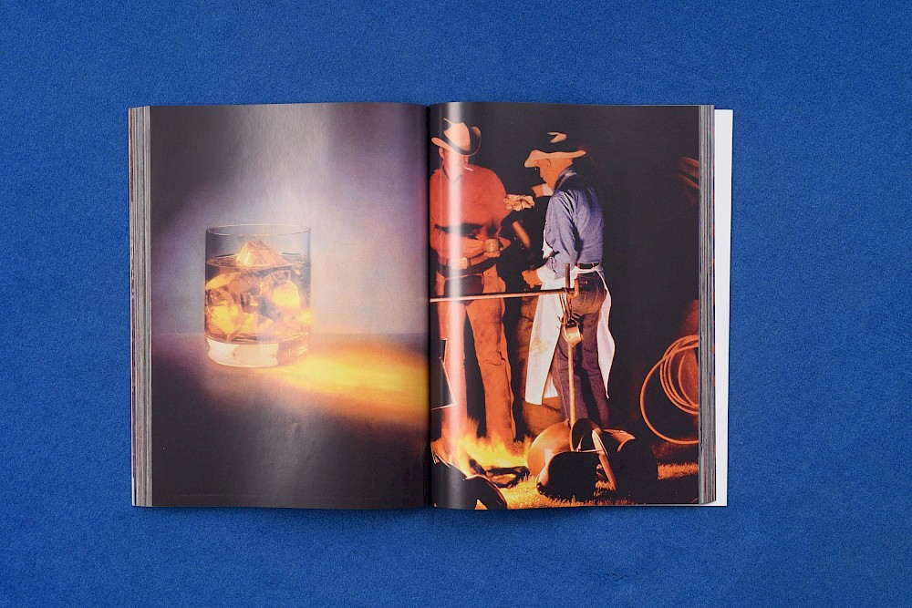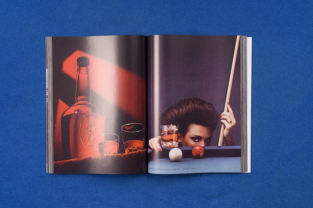 Sur la page-de-gauche, dans une atmosphère très vermillon, une main verse une boisson claire depuis une petite bouteille en verre brun, dans un verre large et bas, contenant une montagne de glaçons. Le fond de l’image est rouge, de même que le textile – sorte de nappe aux mailles serrées – sur lequel le verre est posé, tout proche du bord et du vertige.
