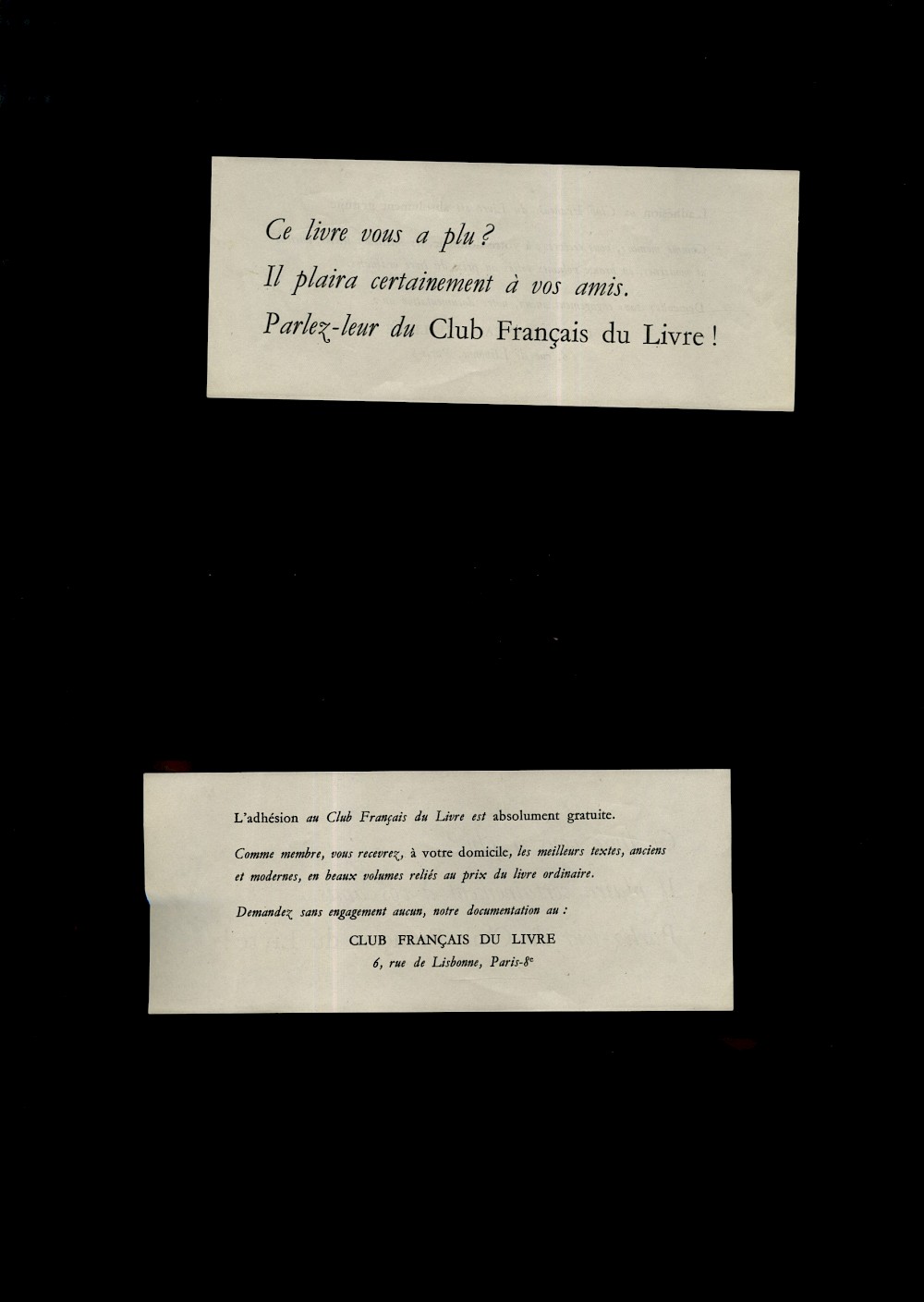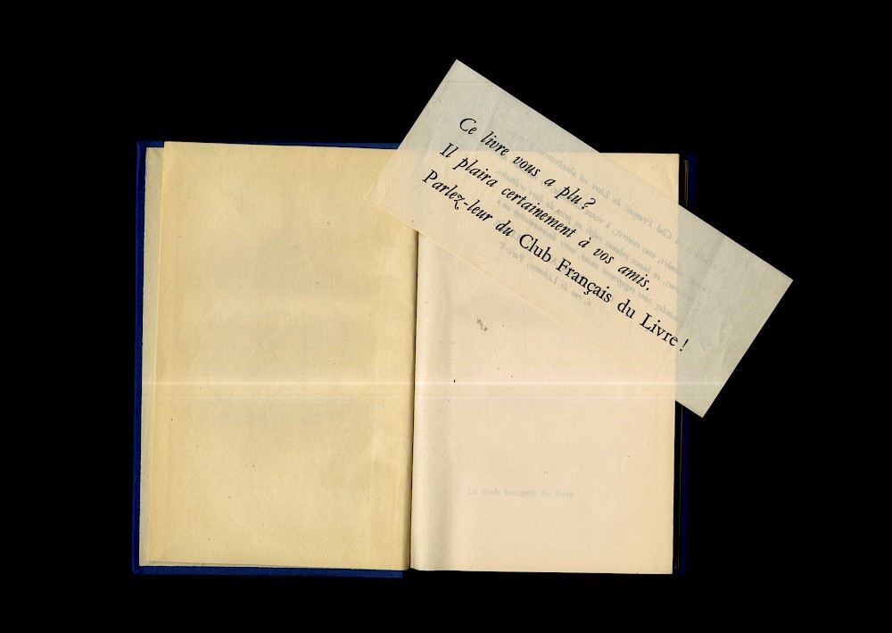 Ephemera mesurant 19,8 cm de longueur sur 8,1 cm de largeur, trouvé dans Le pilote, d’Édouard Peisson, 1937, édité par le Club français du livre (CFL) en 1950.