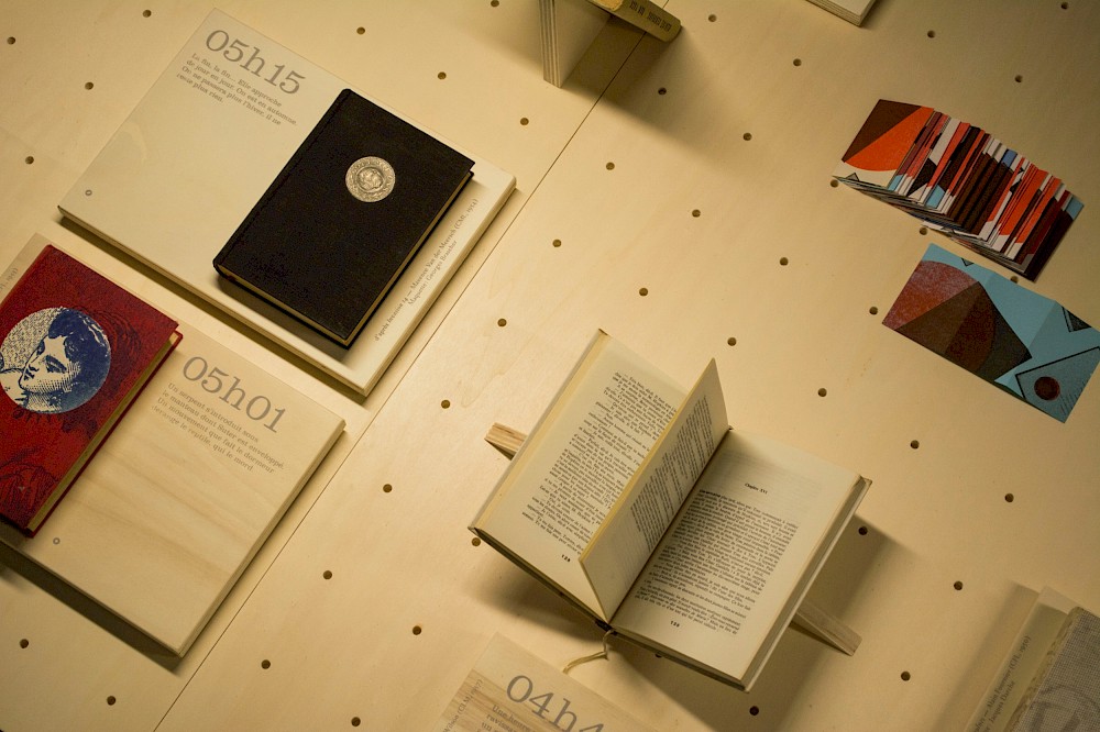 Des ephemeras accompagnent l’ensemble de l’exposition, ainsi qu’une publication dans laquelle on retrouve le récit-scénario cut-up tiré des 27 Clubs issus d’une collection privée. La table-ouvroir sur laquelle se disposent les ouvrages et les ephemeras, est comme un plateau où les livres, entre sculptures et images, viennent souffler des bribes d’histoires. Une tapisserie de « points » pénètre, pour le lecteur-visiteur, dans le détail des ouvrages. Ainsi l’œil, terme typographique et photographique, nous laisse-t-il une trace ronde comme le monde.